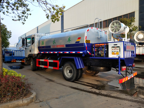 多功能抑塵車主要結(jié)構(gòu)是在行走機構(gòu)上加裝大容積水罐、高效遠程霧炮系統(tǒng)、低壓沖洗灑水系統(tǒng)、綠化灑水高炮(選裝,在罐體前端)、液壓系統(tǒng)、專用的作業(yè)和行走電控系統(tǒng)等改裝而成,其性能在國內(nèi)處于領(lǐng)先水平。