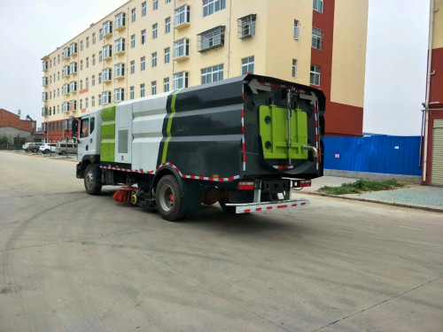 (6)軌道清掃模塊的垃圾箱集塵箱為密閉式、骨架及薄鋼板焊接結(jié)構(gòu),垃圾箱內(nèi)設(shè)有噴水結(jié)構(gòu)及鋼絲濾網(wǎng),垃圾箱內(nèi)灰塵經(jīng)濾網(wǎng)進(jìn)行過濾后,再進(jìn)入風(fēng)機(jī)以減少風(fēng)機(jī)磨損。后門由后門開啟油缸控制,并可通過連桿使后門鎖緊。垃圾箱體及水箱一體化(須考慮計(jì)算整體重心,以防在水平路面車頭揚(yáng)起),水箱采用不銹鋼板制作,內(nèi)置水位報(bào)警器,使水泵運(yùn)行更安全;車尾加裝箭頭警示燈。垃圾箱箱設(shè)置了手動(dòng)泵應(yīng)急系統(tǒng),在副發(fā)動(dòng)機(jī)停機(jī)的狀態(tài)下也能收放、舉升垃圾箱,便于維修保養(yǎng)。