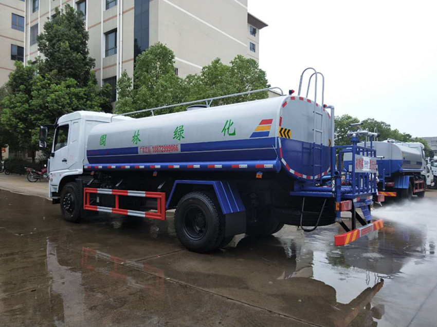 罐體容積為12立方灑水車,罐體鋼板為4mm碳鋼Q235材質(zhì),罐內(nèi)隔板具有防波作用,以減輕汽車行駛時(shí)罐體液體沖擊,罐體及整車外形尺寸按照公告。帶大功率專用灑水泵,泵可自吸自排,整車前沖、后灑、側(cè)噴、帶65消防接口,后平臺(tái)帶綠化灑水炮,灑水炮可全方位旋轉(zhuǎn),可連續(xù)調(diào)成直沖狀、大雨、小雨、毛毛雨;前封頭帶水位計(jì),后平臺(tái)主管路帶1寸澆花接口,后爬梯。平臺(tái)后部帶小安全告知牌:“隨時(shí)停車,注意安全”,帶兩根水管及陰陽(yáng)端。罐體顏色:上白/下藍(lán),銀灰/銀藍(lán),罐體兩側(cè)噴“灑水車、綠化噴灑車”字樣,貼反光標(biāo)示。灑水車可加裝前沖后灑氣動(dòng)閥駕駛室控制、可加裝霧炮機(jī)組發(fā)電機(jī)組噴霧降塵裝置、車頭可加裝推雪雪鏟、雪滾裝置街道、公路除雪等