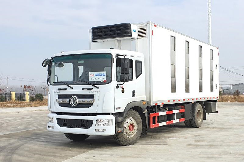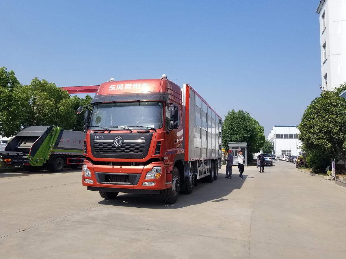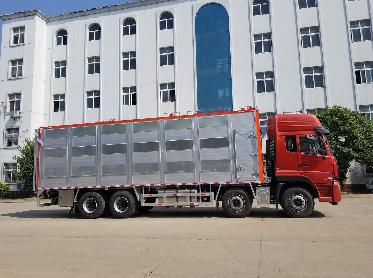 東風(fēng)天龍前四后八全鋁合金運(yùn)輸車,又稱鋁合金禽畜運(yùn)輸車,可做三層或四層,品質(zhì)更佳,車身結(jié)構(gòu)采用鋁合金打造,不銹鋼噴頭和飲水頭,相比鋼制車體,重量減輕20%-30%,可以裝載更多的畜禽,空車行駛節(jié)約燃料,低維保費(fèi)用,不生銹,生命周期無線延長,無需漆面保護(hù),清潔簡(jiǎn)單便捷,操作簡(jiǎn)易,車廂升降平臺(tái)由全液壓控制,遙控操作更加簡(jiǎn)便,自動(dòng)恒溫系統(tǒng),車廂設(shè)計(jì)合理方便控制家禽上下車,遙控升降車,動(dòng)物福利,更大的 內(nèi)部空間,家禽在車廂內(nèi)更感舒適,溫度控制系統(tǒng),沖淋飲水系統(tǒng),遙控側(cè)面通風(fēng)系統(tǒng),可開合側(cè)窗系統(tǒng),強(qiáng)制通風(fēng)系統(tǒng)。