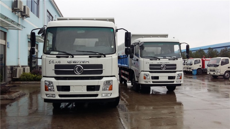 卸料結(jié)構(gòu):東風(fēng)天錦對接式垃圾車系用箱卸料,由兩只液壓油缸直接舉升車廂進(jìn)行卸料,箱底與地面夾角不小于45度,以實(shí)現(xiàn)垃圾依靠自重能自行卸下的專用自卸運(yùn)輸車。