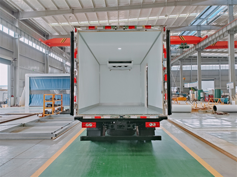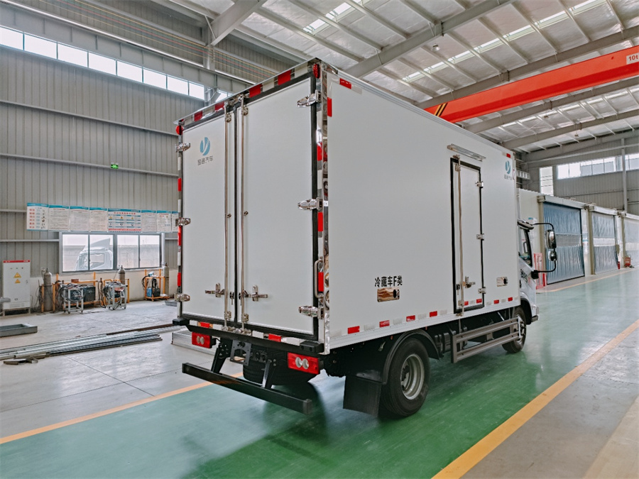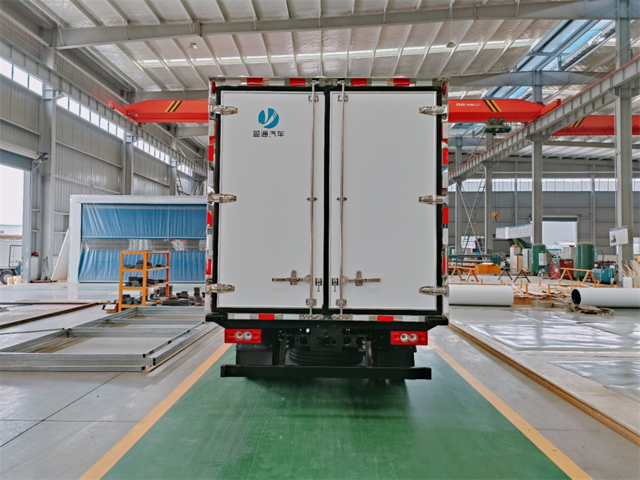 廂體采用內(nèi)外玻璃鋼材料制作,中間夾層為高密度保溫材料,用真空復(fù)合一次成型,表面光潔平整,強(qiáng)度高,使用壽命長(zhǎng),廂體邊緣采用優(yōu)質(zhì)鋁合金包邊和專(zhuān)用密封膠處理,具有重量輕、保溫、密封效果好等特點(diǎn)。門(mén)框鎖件為不銹鋼材質(zhì),門(mén)四周用一次成型密封條密封,廂體外形平整美觀,車(chē)廂頂部加以雨檐,避免下雨天雨水對(duì)車(chē)廂的浸泡,延長(zhǎng)廂體使用壽命,車(chē)廂內(nèi)配有人性化照明系統(tǒng)。穩(wěn)固性和氣密性是普通冷藏車(chē)廂體不可比的,并且具有質(zhì)量輕,抗沖擊力強(qiáng),無(wú)滲透等優(yōu)點(diǎn)。配備國(guó)產(chǎn)580制冷機(jī)組。