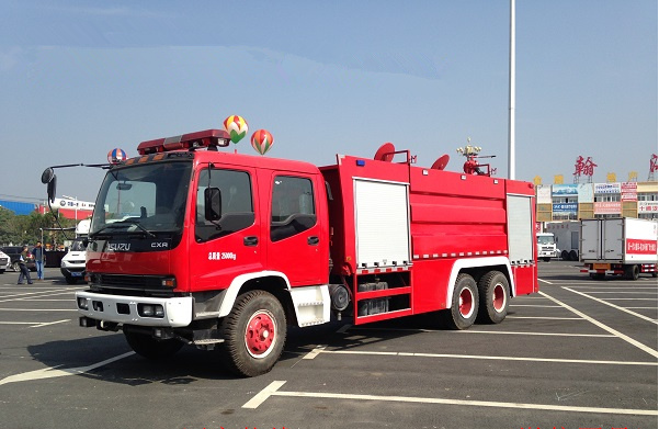 五十鈴11-12噸雙橋消防車采用慶鈴QL1250WPFZY底盤改裝,平頭雙排駕駛室,五十鈴6HK1-TCH發(fā)動機,300馬力,罐體容積11-12立方米(水罐容積8立方米,泡沫罐容積3立方米);整車結(jié)構(gòu)緊湊,方便靈活,動力性能好,車速高,能自由進出鄉(xiāng)村狹窄道路及小區(qū),具有大型消防車的全套消防功能,上裝箱體的上裝骨架全部采用引進歐洲技術(shù)生產(chǎn)的鋁合金型材制造,整車的重量減少,機動性能和整車載重量提高。除了裝備消防水泵及器材以外,還設(shè)有較大容量的貯水罐及水槍、水炮等。可將水和消防人員輸送至火場獨立進行撲救火災(zāi)。也可以從水源吸水直接進行撲救,或向其他消防車和滅火噴射裝置供水。在缺水地區(qū)也可作供水、輸水用車,主要適用于大中城鎮(zhèn)、鄉(xiāng)村狹窄街道、城市小區(qū)、繁忙的批發(fā)市場等場所的一般物質(zhì)滅火,閑暇時可用于園林噴灌、道路清灑。