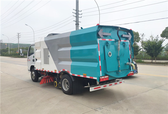 該洗掃車采用國六東風(fēng)多利卡二類底盤改裝,加裝副發(fā)動(dòng)機(jī)、風(fēng)機(jī)、清水箱、垃圾箱、左右立掃、掃盤降塵系統(tǒng)、左右高壓側(cè)噴高、吸盤內(nèi)置高壓主噴桿、氣動(dòng)系統(tǒng)、液壓系統(tǒng)、專用裝置電控系統(tǒng)和副車架等改裝而成。