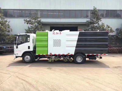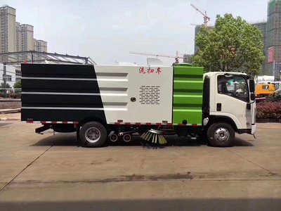 本洗掃車采用重慶五十鈴(700P)型國5二類底盤改裝,加裝副發(fā)動機、風機、高壓水泵、清水箱、垃圾箱、左右立掃、帶噴水桿的寬吸嘴、低壓沖洗系統(tǒng)、垃圾箱自潔,掃盤降塵系統(tǒng),液壓系統(tǒng)、專用裝置電控系統(tǒng)和副車架等改裝而成: