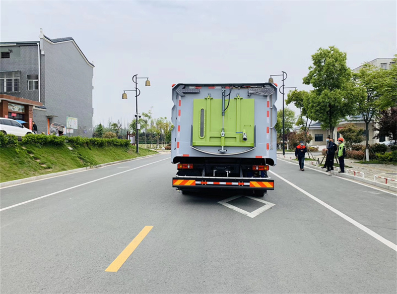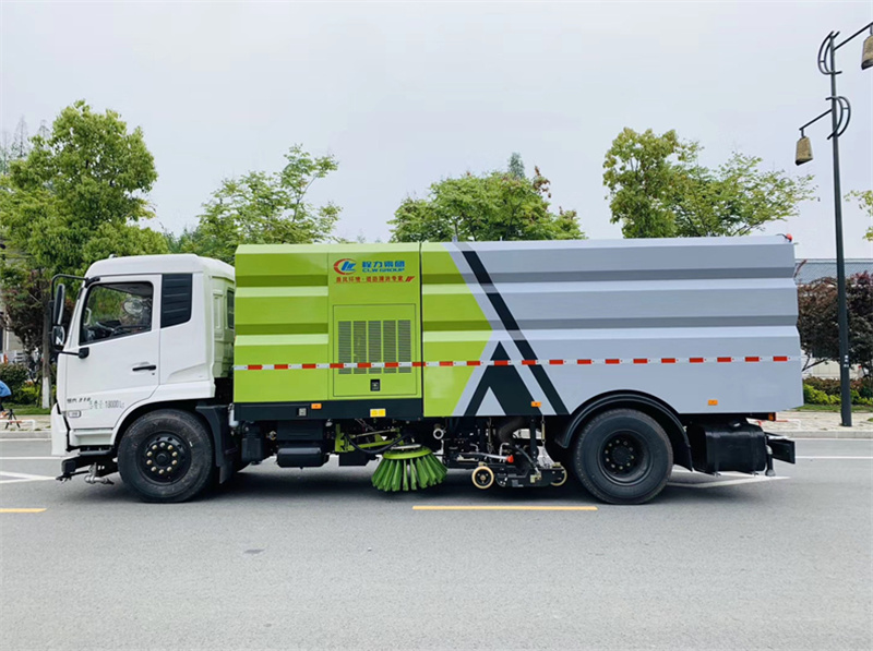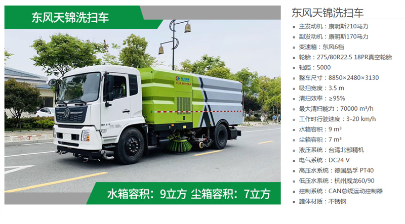 東風18噸洗掃車,帶2個中置掃盤,天錦為康明斯170馬力副發(fā)動機;三洋馬達;高壓水泵(前沖/側(cè)噴/中噴/后噴霧/沖洗水槍/垃圾箱自潔裝置);高壓路沿清洗噴頭,低壓泵(前沖);不銹鋼垃圾箱;控制器;控制箱;PLC一鍵控制;尾部LED箭頭燈;垃圾箱、水箱均帶防溢低水位報警裝置;倒車及洗掃狀態(tài)室內(nèi)監(jiān)視器。20m高壓沖洗卷盤。