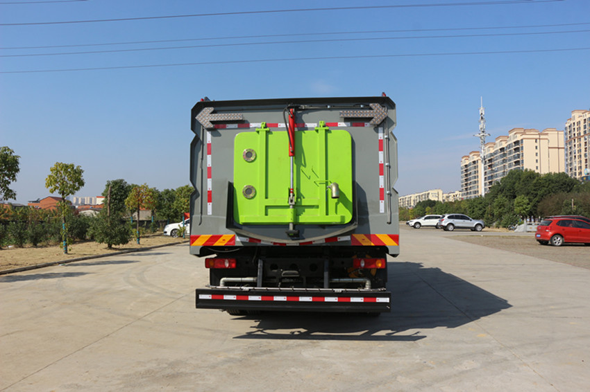 Ø 清水箱充分利用了車載空間,容積大,容積達(dá)9m3。垃圾箱采用單層304不銹鋼結(jié)構(gòu),傾翻卸料,帶高壓自潔裝置。自潔裝置可在垃圾箱卸料時(shí)幫助卸料,清洗垃圾箱內(nèi)部。